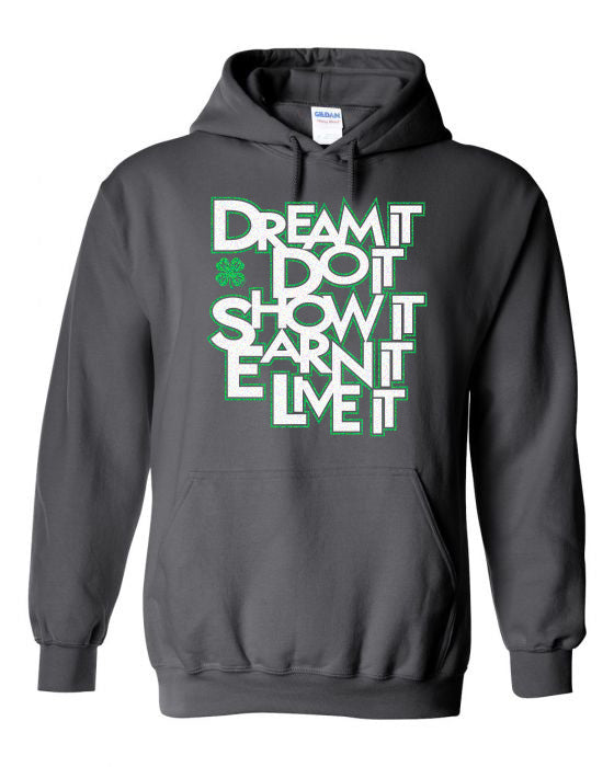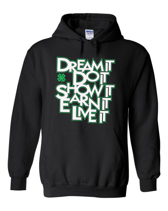 This Gloucester County 4-H Dream It, Do It, Show It, Earn It, Live It Hoodie is available to order in Youth & Adult sizing on a Heavy Blend Hooded Sweatshirt in Black, Charcoal and Navy.